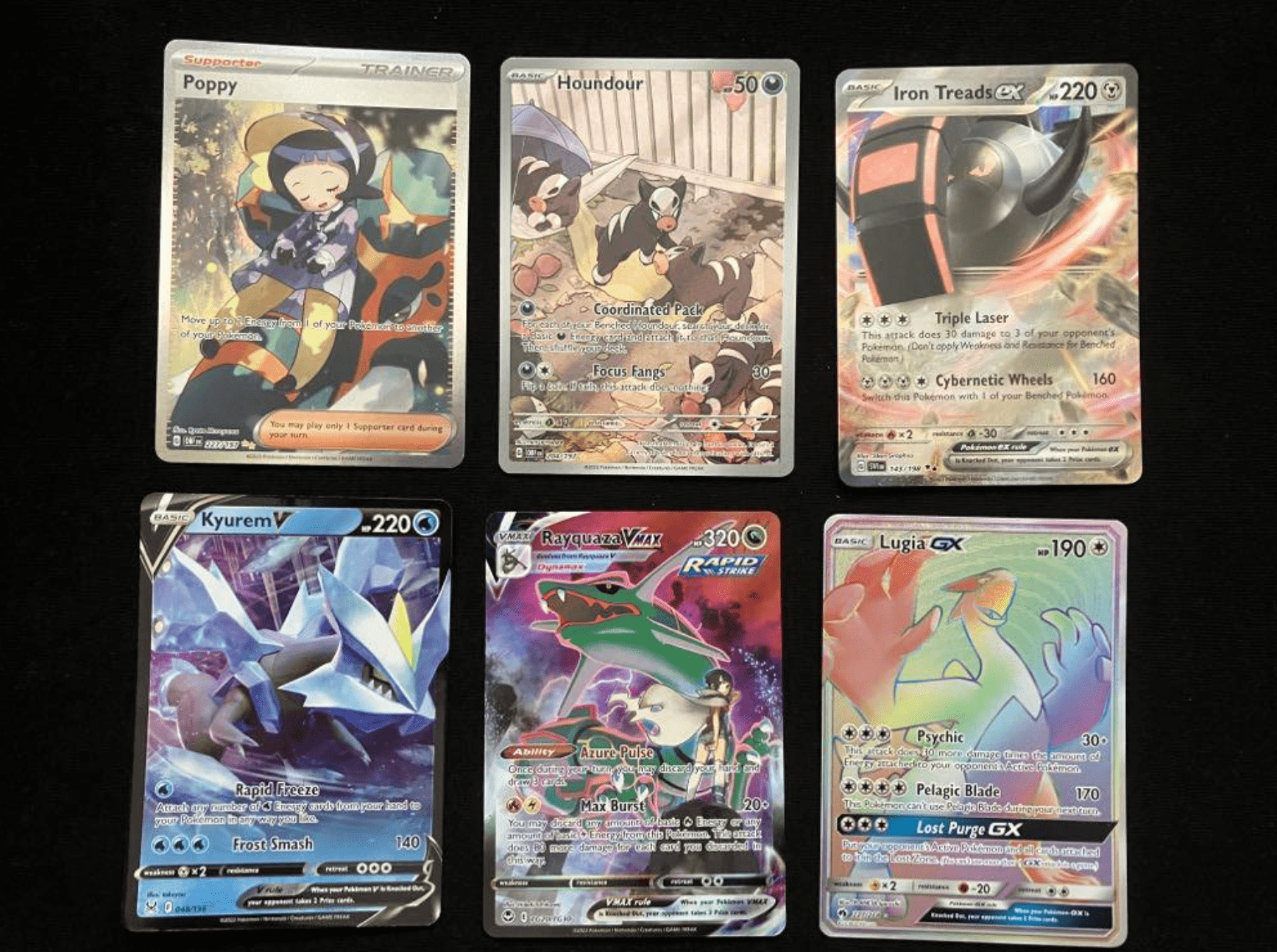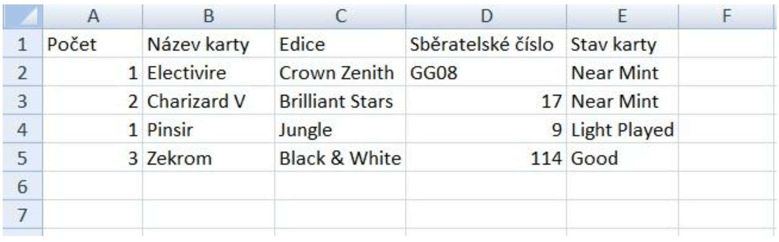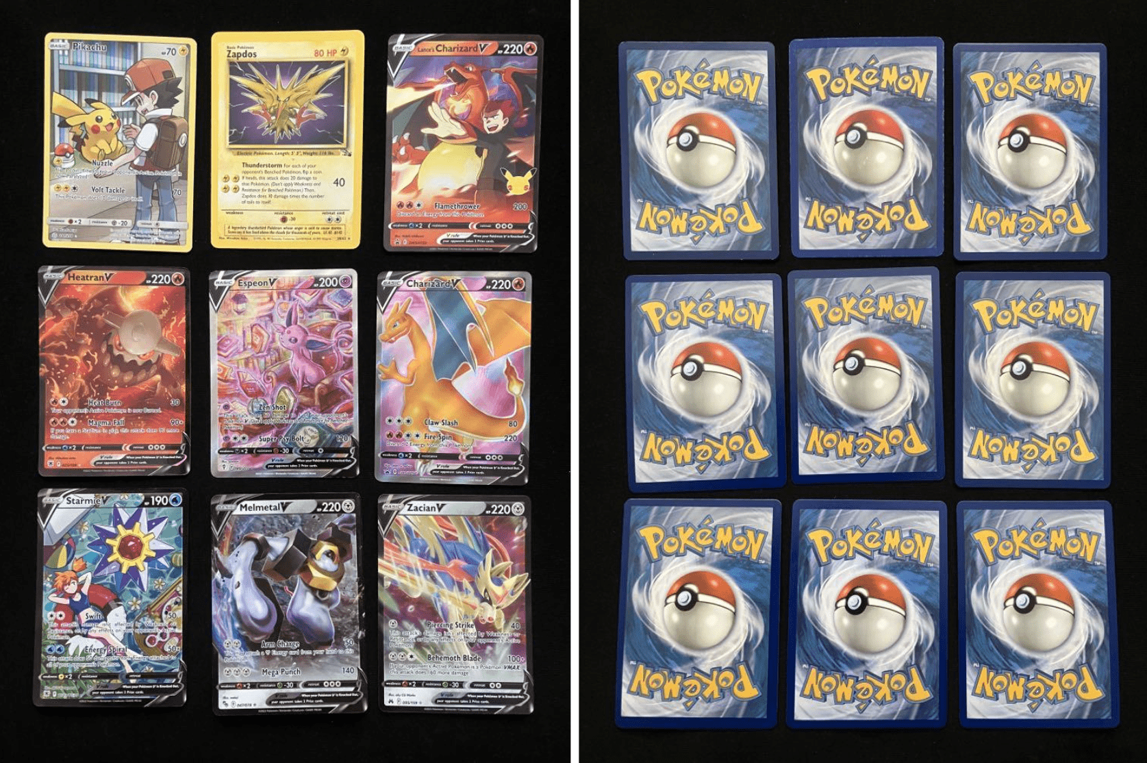 Ze své sbírky vyndejte hodnotnější karty a vyfoťte je na černém podkladu. Poprosíme Vás, aby na každé fotce bylo maximálně 9 karet. Karty prosím vyfoťte z obou stran podle vzoru níže. Karty prodávané v bulku není třeba fotit, jen je potřeba je spočítat.